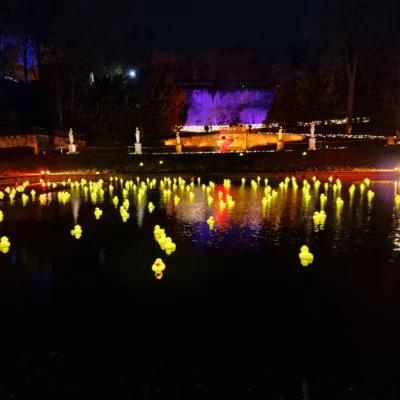 Canards en Seine est un effet lumineux installé au cœur d’un espace aquatique, une présence lumineuse discrète qui modifie la perception de la surface de l’eau. Des centaines de canards lumineux flottent, immobiles ou presque, comme suspendus entre ciel et reflet. Leur présence ne raconte pas un voyage, mais un instant à contempler, un tableau vivant offert au regard.