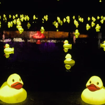 Canards en Seine est une invitation à la pause et à l’émerveillement. Un effet aquatique où la lumière flotte, où le temps semble ralenti, et où l’eau devient le lieu d’une poésie tranquille. Sans récit imposé, l’installation laisse place à l’imaginaire du spectateur, transformant l’espace en une parenthèse lumineuse, fragile et délicatement enchantée.